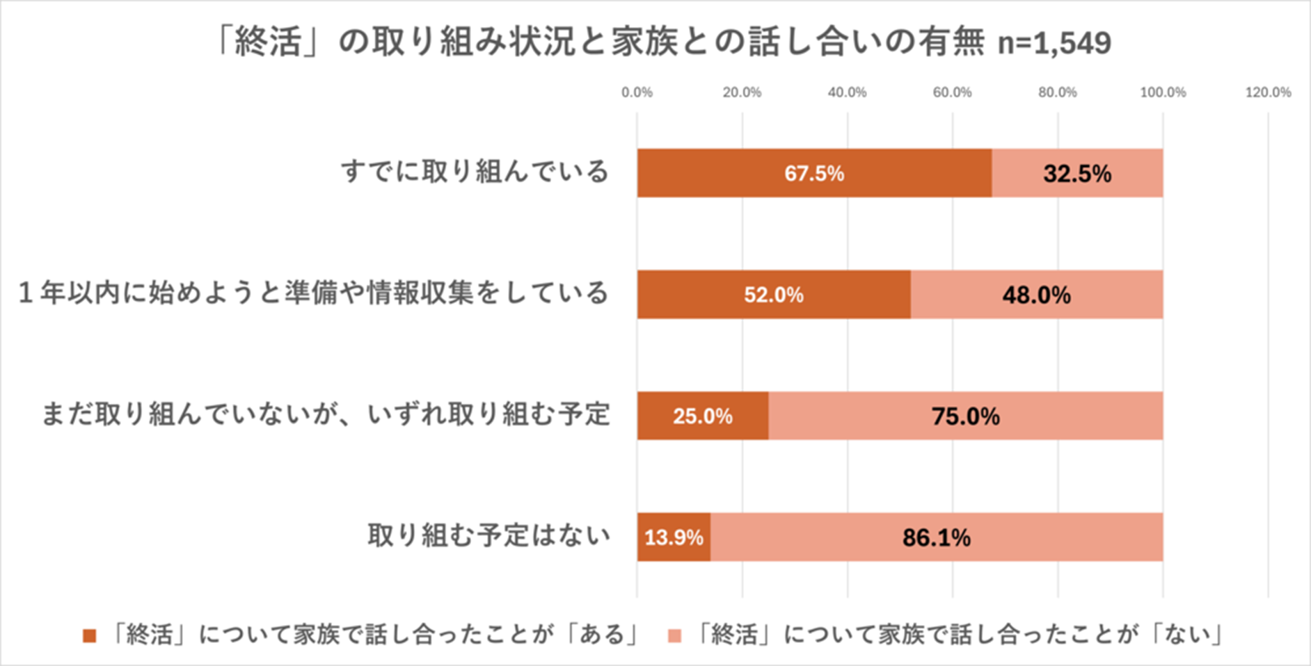 終活の現在の取り組み状況とあわせてみても、「すでに取り組んでいる」人でも、家族と話し合いをしたことが「ある」と回答したのは67.5%にとどまり、話し合いをしたことが「ない」という人は32.5%でした。「1年以内に始めようと準備や情報収集をしている」という人でも、家族と話し合ったことがある人とない人で、おおよそ半々に分かれました。