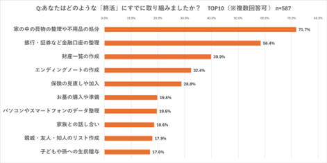 すでに終活に取り組んでいる人に、どのようなことに取り組んだかを尋ねると、もっとも多かったのは「家の中の荷物の整理や不用品の処分」71.7%でした。2位が「銀行・証券など金融口座の整理」58.4%、3位が「財産一覧の作成」39.9%となりました。モノの片付けのほかに、お金に関わる準備をしている人が多いことがうかがえます。