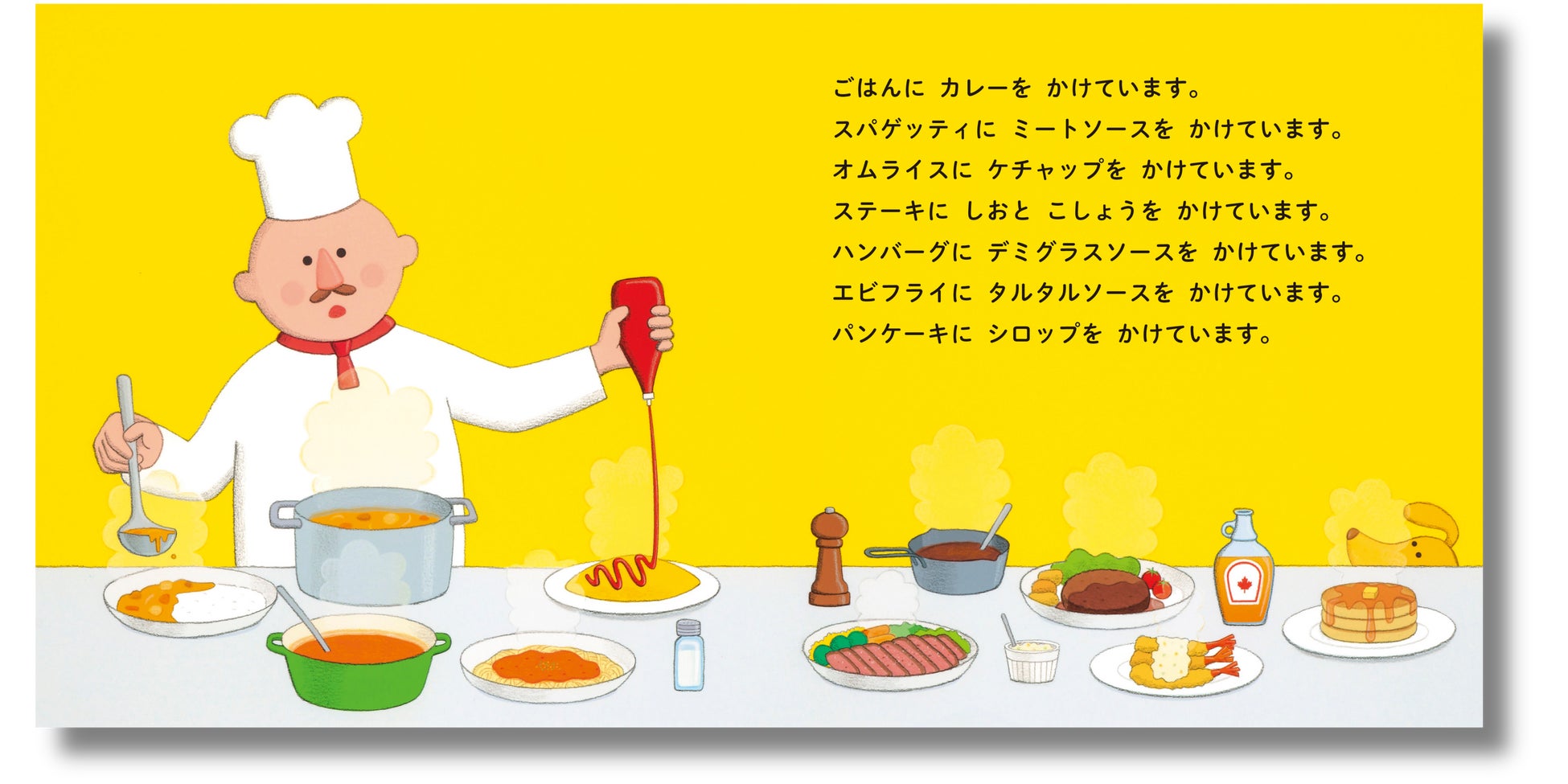 著者は、大人気絵本『もいもい』の市原淳さん。第一弾では力士が主人公でしたが、今回は几帳面なコックさんが大活躍。キッチンでも、外でも、“かけ”まくります。カラフルで遊び心あふれる絵が子どもたちの想像力をくすぐり、思わずクスッと笑ってしまう、ナンセンスな世界。声に出しても、耳で聞いてもおもしろい、笑って学べることばあそび絵本の真骨頂です。読んだあと、身の回りの“同音異義語”を探して、ことばあそびをもっと楽しもう!