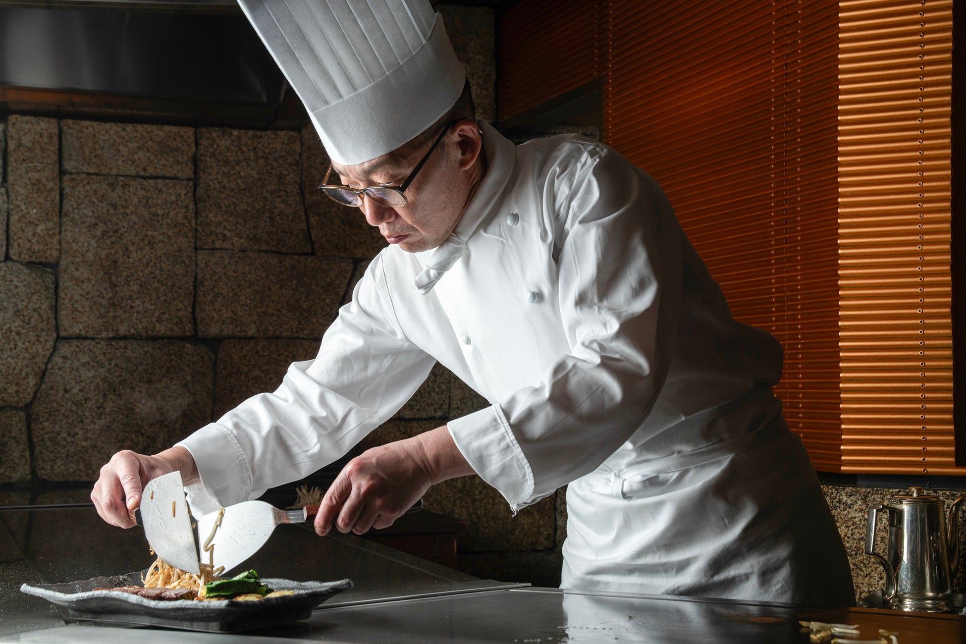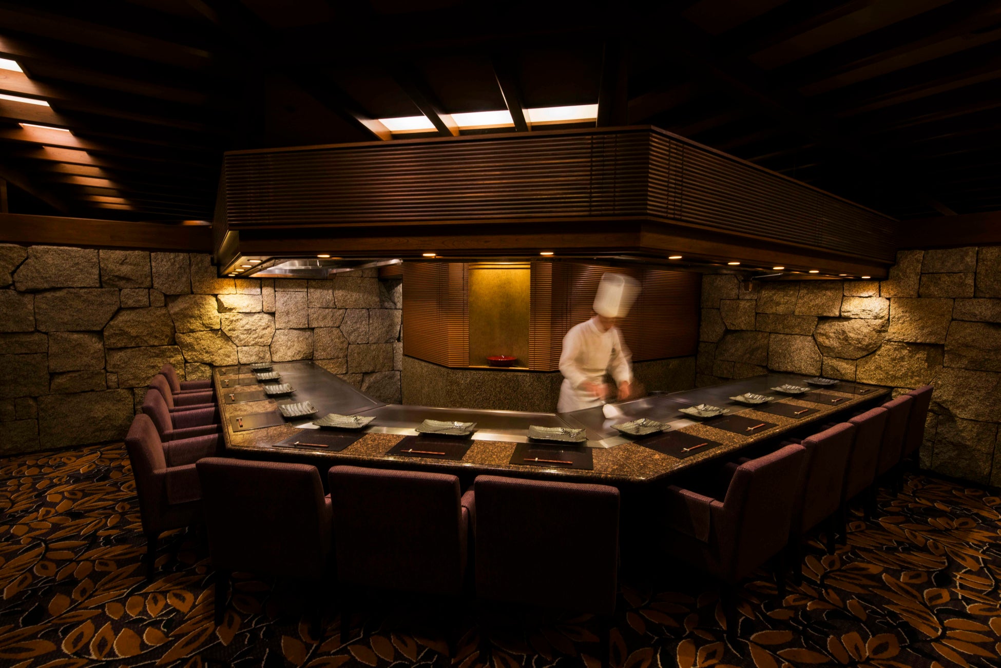 ホテルと共に40年歩んできた歴史ある店内。足を踏み入れると、まず目に飛び込むのは、悠久の時を刻んだかのような重厚な石垣の壁。職人技が光るその圧倒的な存在感が、空間に深い奥行きを与えます。鉄板の奥には、研ぎ澄まされた銅管パイプの壁が静かに光を放ち、石垣の力強さとは対照的な、モダンで洗練された美しさを演出します。異なる二つの素材が調和する特別な空間です。