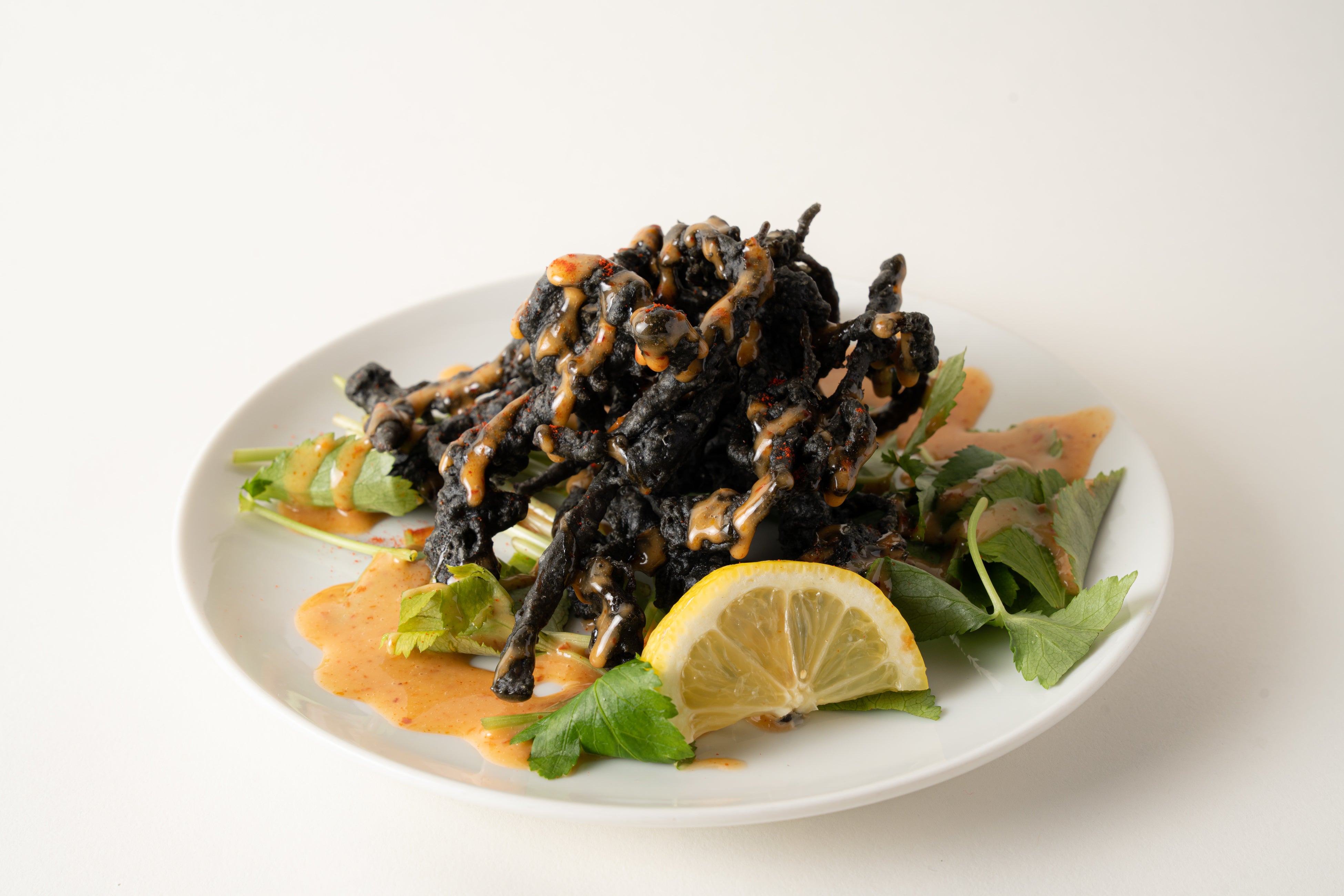 サキイカを竹炭入りの特製天ぷら粉で揚げた、世にも奇妙な真っ黒な天ぷらです。自家製のピリ辛豆板醤マヨネーズで!