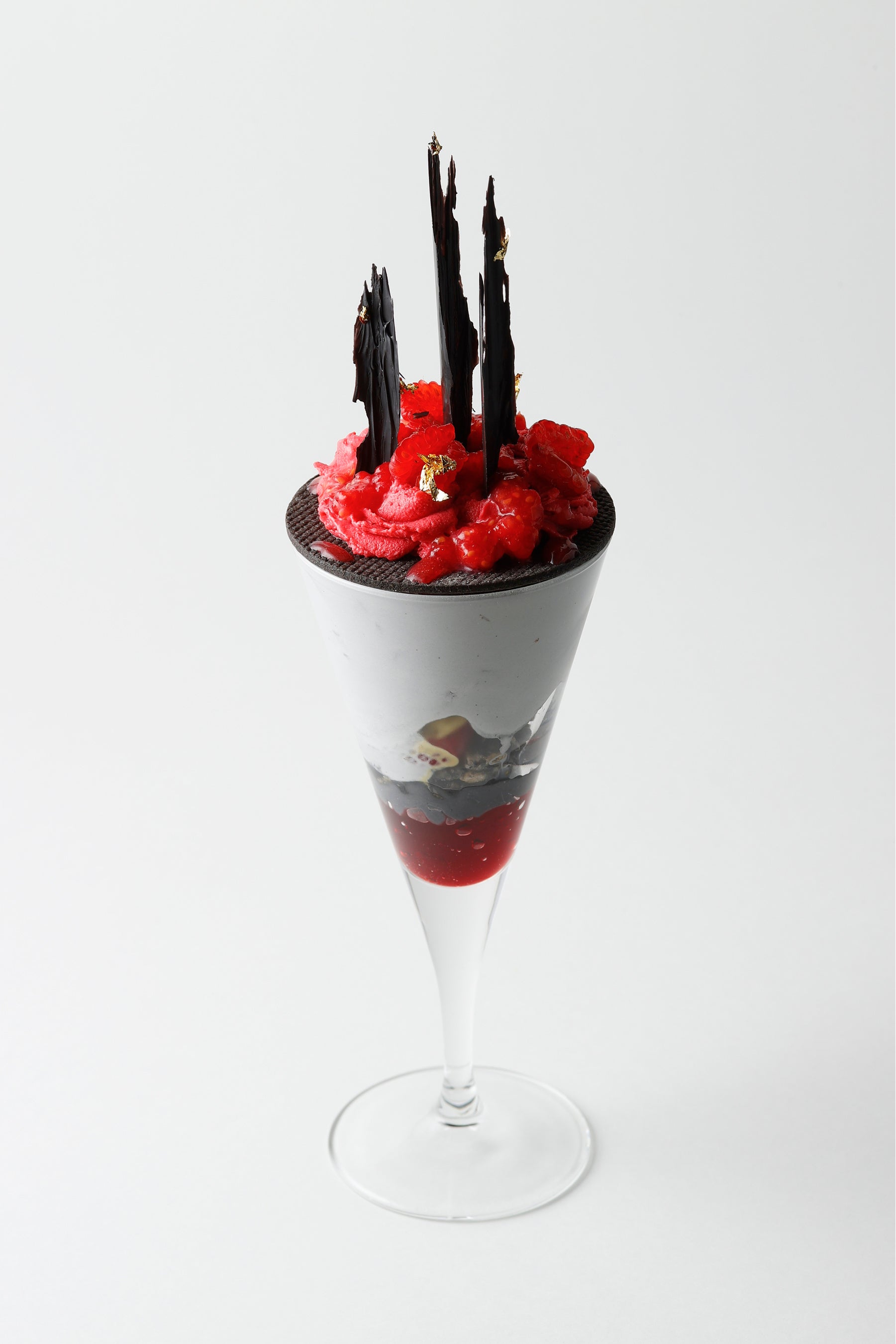 トップ部分は夜の廃墟とそこに灯る灯りを金箔で表現し、ラズベリーソースはゾンビにちなみ流れる血をイメージ。