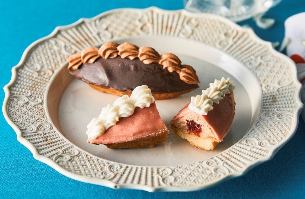 小舟の形をした栗のタルトはフランスの伝統菓子。フランボワーズ味はフランスフェアのために作られました。