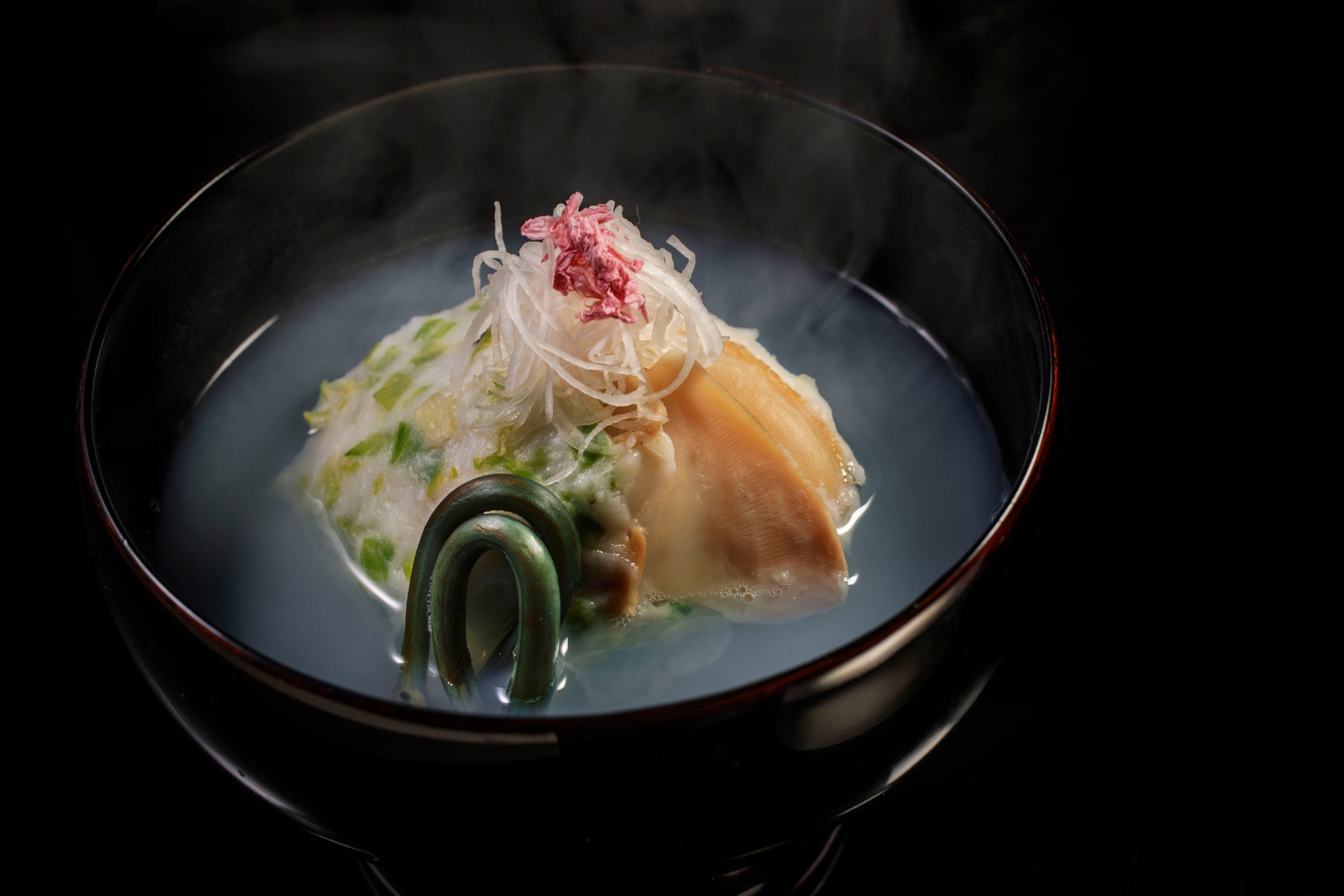 霞仕立ての出汁に、蛤の身と春キャベツの真薯を浮かべた椀盛です。弾力のある蛤と、春キャベツの瑞々しい食感が特徴です。蛤の旨味を凝縮させた出汁に、ワラビやウドなど、春特有の山菜を添えることで、海と山の旬の食材が調和した奥行きのある味わいに仕立てました。
