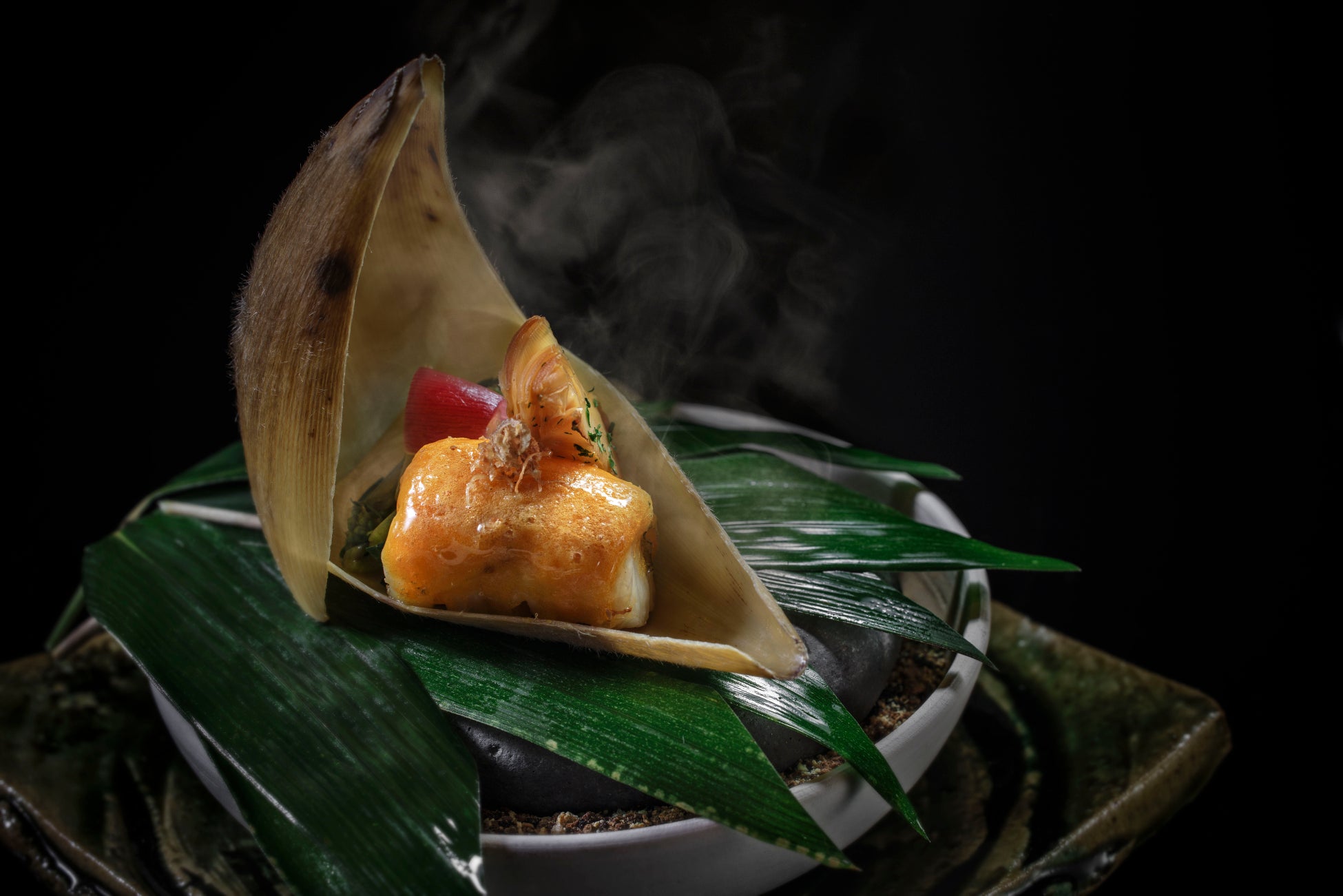 清流で育ったシナノユキマスを、素材の繊細な甘みを引き立てる黄身醤油で、色鮮やかに焼き上げた一品です。器に筍の皮を用い、谷の集落に訪れる春の情景を表現しています。鼻に抜ける爽やかな辛みの花山葵の醬油漬けが、焼き物の旨味をより一層際立たせます。