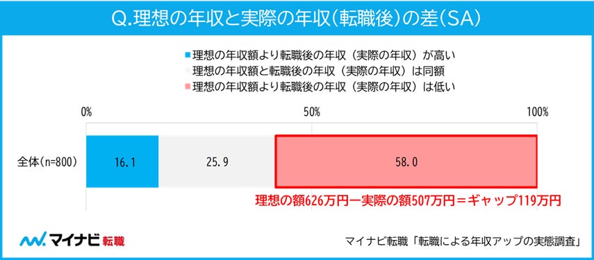 また、理想の年収額は平均626万円に対し、転職後の実際の平均年収は507万円となり、理想と現実の差は約120万円だった。転職で年収アップを叶えても、まだまだ理想と現実の間には大きなギャップが存在していると見られる。【図3】