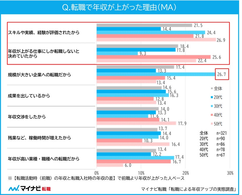 ◆年収が上がった理由は、「スキルや実績、経験が評価された(21.5%)」がトップ。年収アップ額が最も高い30代では、「規模が大きい企業への転職」がトップで、4人に1人以上が回答