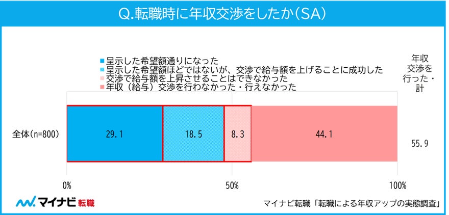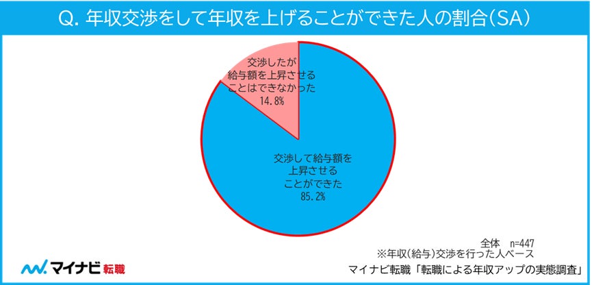 転職時に年収交渉をした人は、55.9%で半数を超え、そのうち年収アップに成功しているのは85.2%だった。