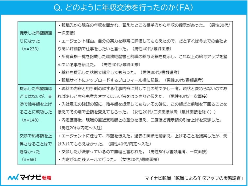 年収交渉の方法を自由回答で聞いたところ、「前職の給与明細を提示」「現状と変わらないのであれば考えさせてほしい旨を伝えた」などが挙がった。【図4、5、6】