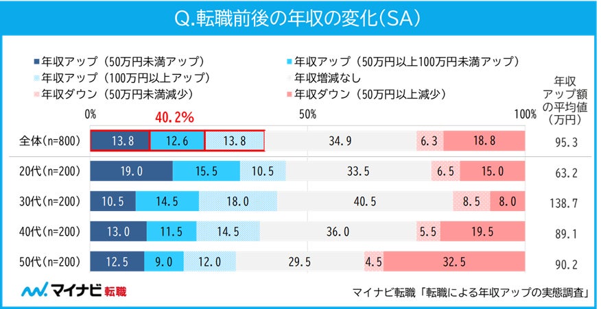 ◆転職で年収アップした人は4割。30代の約5人に1人は100万円以上の年収アップに成功