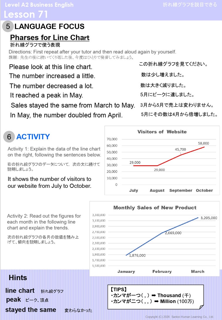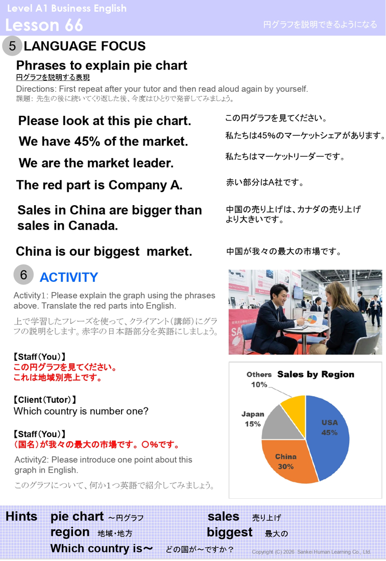 特にリニューアルしたA1/A2/B1コースの後半、レッスン51~75「Meeting&Presentation」パートでは、この「会議の英語」の力をつける内容に刷新しました。「数字」「グラフや表」を説明できる力を身につけると共に、オンライン会議での必須表現など、最新のオフィス業務で役立つシーンが盛り込まれています。