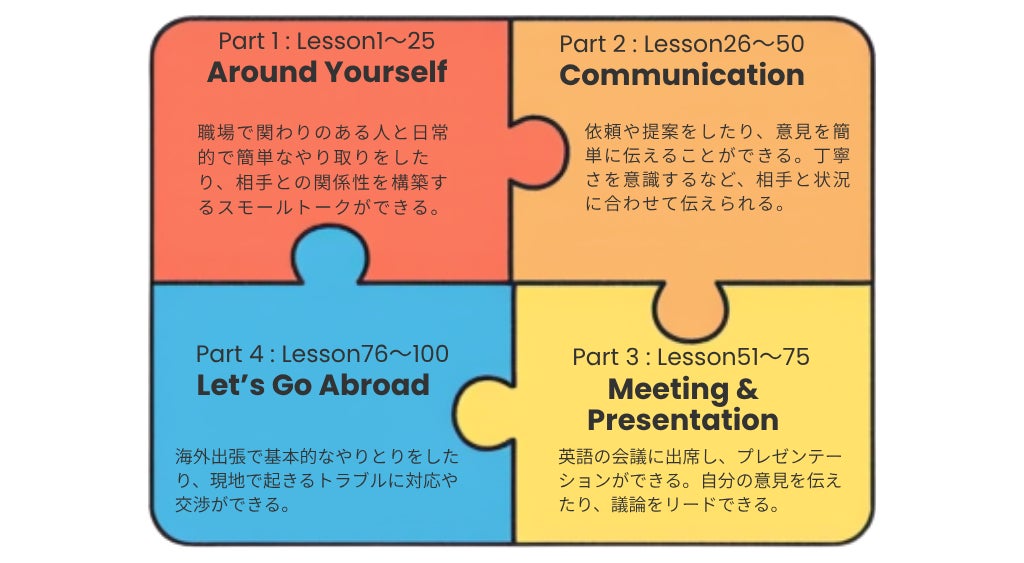 今回のリニューアルでは、A1/A2/B1コースの後半(レッスン51~75)の内容を「会議の英語」に特化した構成へと刷新いたしました。オンライン会議で欠かせない必須表現をはじめ、最新のオフィス業務に即したシーンを数多く盛り込んでおります。