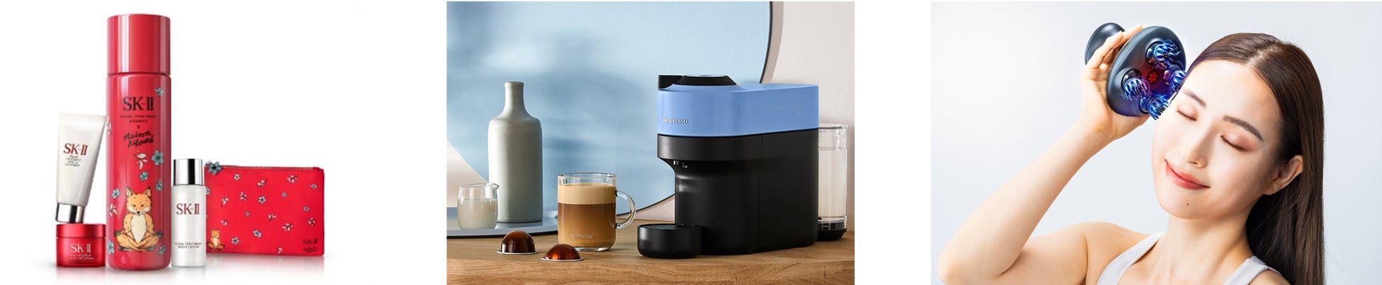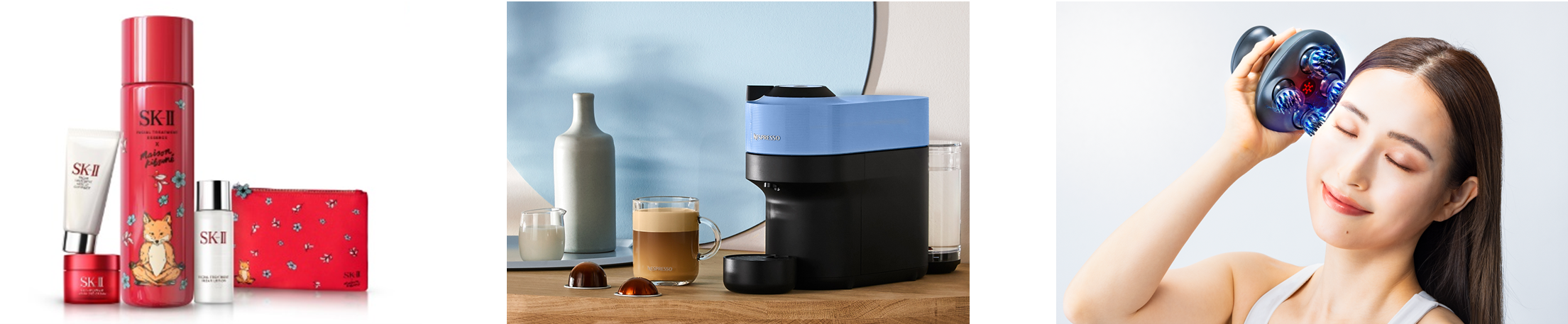 クリスマスギフト関連商品は、約460万点(注3)が販売されており、その流通額は、2019年から2022年で約3倍(注4)に拡大しました。玩具や絵本などの子ども向けのギフトのほか、宝飾品やファッションアイテム、美容・キッチン家電などの流通が増加傾向にあり、「自分買い」がその需要拡大を後押ししていると分析しています。「楽天市場 クリスマス特集2023」では、贈る相手やジャンル別、予算別などの切り口で様々なギフト関連商品を紹介するコンテンツを用意しています。また、定番の子ども向けのクリスマスギフトやファッション雑貨やコスメ、美容・キッチン家電などのギフト向け商品のほか、パーティグルメやクリスマスケーキ、装飾品なども紹介しています。