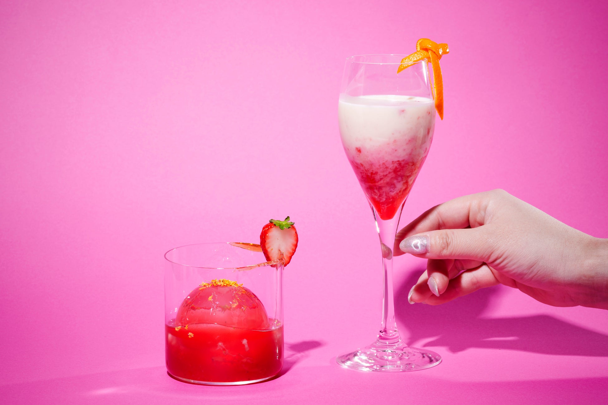 旬のいちごを使用した2種類の特製カクテルが登場。リボンをあしらった可愛らしいデザインが目を引く、いちごとバナナを合わせた優しい甘さのカクテルと、バーボンに漬け込んだいちごに飴細工と金木犀を添えた、香り豊かで深みのあるカクテル、それぞれ異なる個性が、特別なひとときを演出します。