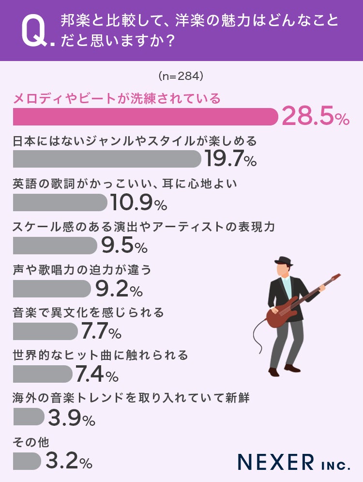 そこで今回は、東京拠点の外国人タレント・モデル事務所『L'agente』と共同で、事前調査で「洋楽に興味がある」と回答した全国の男女284名を対象に「洋楽の魅力」についてのアンケートをおこないました。