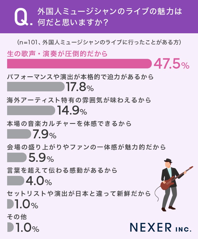 ■47.5%が、外国人ミュージシャンのライブの魅力は「生の歌声・演奏が圧倒的だから」と回答