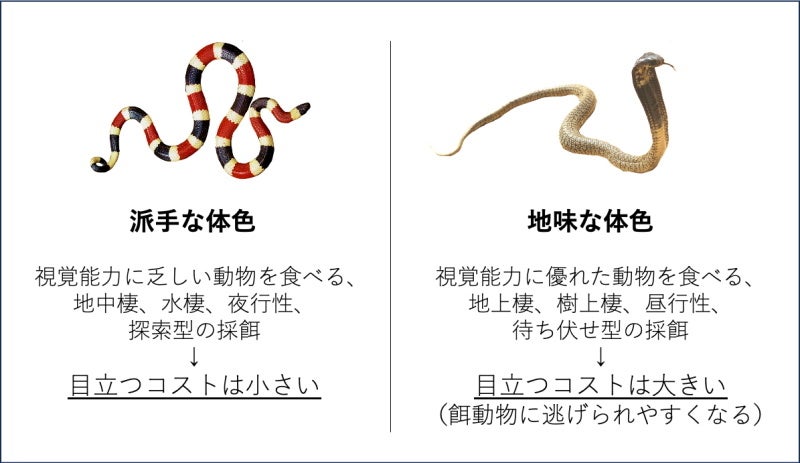 研究グループは、コブラ科とマイマイヘビ科を対象に種間比較を行い、目立つコストによって警告色・擬態の進化を予測できるかどうかを検証しました。解析の結果、食性の特殊化、地中性、夜行性といった特徴によって採餌における目立つコストが緩和されている系統で、派手な体色が進化しやすいことが示されました。