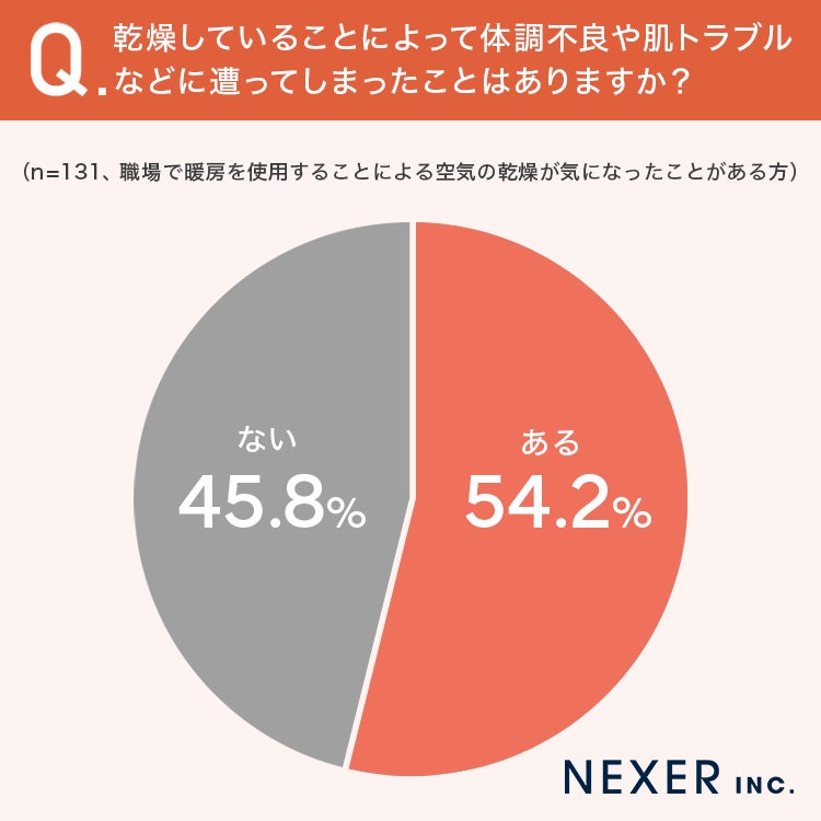 そのうち半数以上の方が、乾燥していることによって体調不良や肌トラブルなどに遭ったことがあると回答しています。