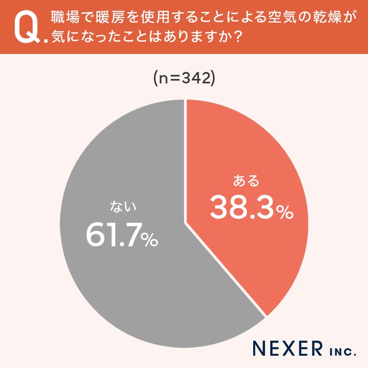 38.3%と約4割の方が、職場で暖房を使用することによる空気の乾燥が気になったことがあると回答しました。