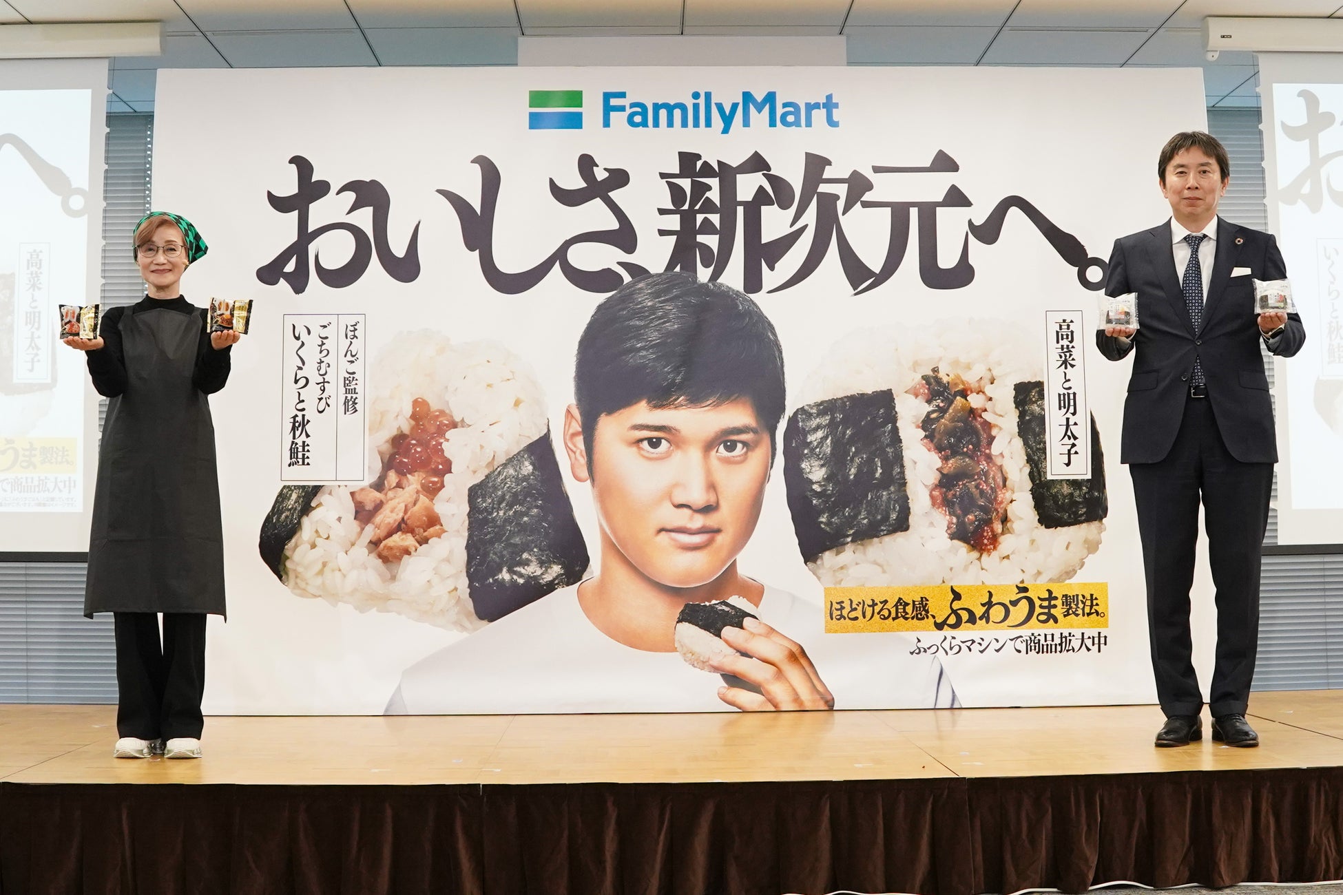 続いて、11月のおむすびキャンペーンの紹介パートでは、上部に「おいしさ、新次元へ。」のコピーが掲げられ、中央には”ふわうま製法”の新商品を手にした“ファミリーマートおむすびアンバサダー”大谷選手が大々的にデザインされた、インパクトのある新キャンペーンのビジュアルが公開されました。木内は、「おいしさ、新次元へ。」というコピーについて、「野球界おいて、まさに”新次元”へと突入した大谷選手の如く、”ふわうま製法”でコンビニおむすび界の新次元へと突入した今回の商品を表現しております」とコメントしました。