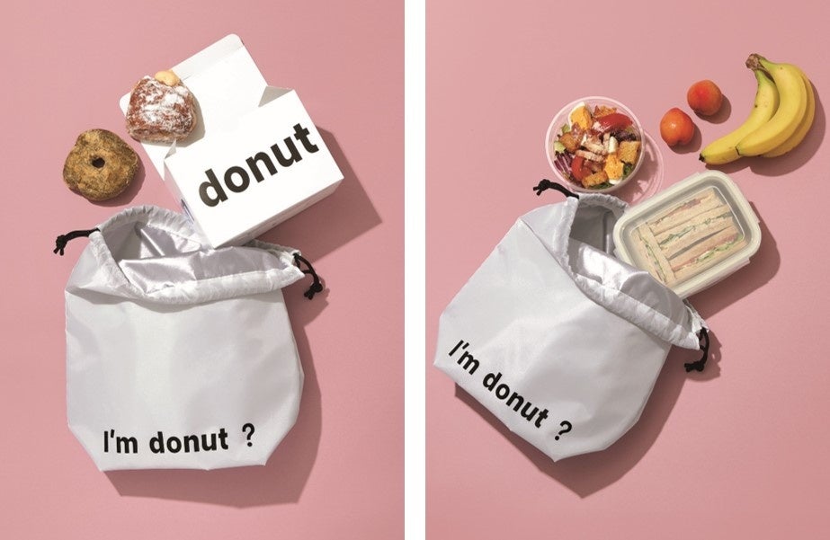 おしゃれな「I’m donut ?」のロゴ入り巾着は保冷機能つきで、気温が高くなる季節のお出かけにぴったり。深さがあるので、ランチボックスを重ねて入れられます。
