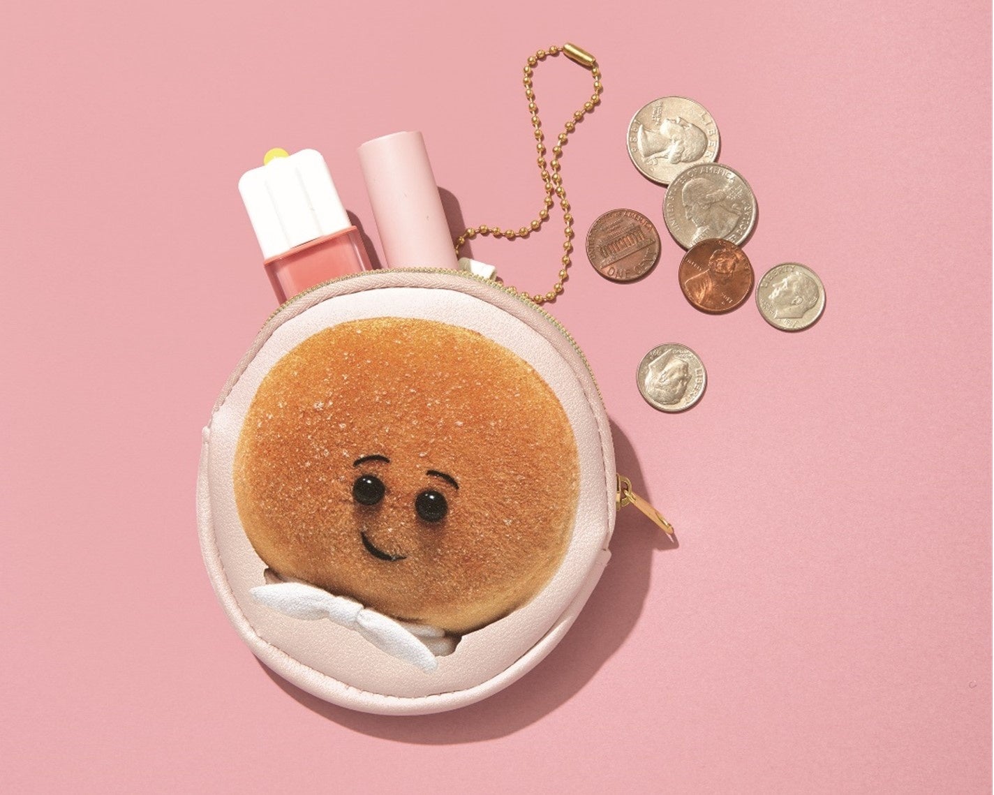 「I’m donut ?」の看板キャラクター、“あいむくん”のチャームポーチは可愛いピンクベージュ。コインやリップなど小物を入れるのにぴったりなサイズです。ボールチェーン付きなので、クリアトートやお持ちのバッグにつけられます。