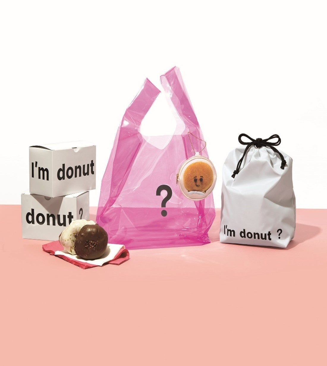 保冷巾着はクリアトートにすっぽりと入るサイズ。トートバッグにプリントされた「?」と巾着のロゴ「I’m donut ?」をレイヤードして楽しめます。あいむくんのチャームポーチもつけて夏のお出かけを楽しんでみては?