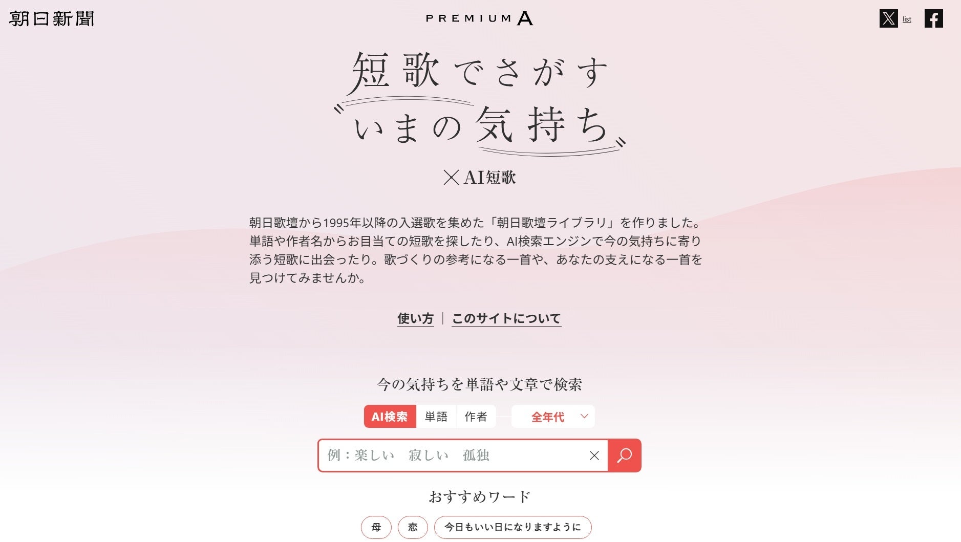 朝日歌壇から1995年以降の入選歌約5万首を収めたライブラリです。「恋」「寂しい」といった単語や作者名から目当ての短歌を探したり、AI検索エンジンで今の気持ちに寄り添う短歌に出会ったりすることができます。