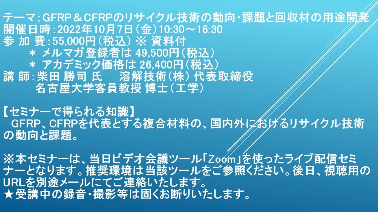 先端技術情報や市場情報を提供している(株)シーエムシー・リサーチ(千代田区神田錦町: https://cmcre.com/ )では、 各種材料・化学品などの市場動向・技術動向のセミナーや書籍発行を行っておりますが、 このたび「GFRP&CFRPのリサイクル技術の動向・課題と回収材の用途開発」と題するセミナーを、 講師に柴田 勝司 氏 溶解技術(株) 代表取締役 名古屋大学客員教授 博士(工学))をお迎えし、2022年10月7日(金)10:30より、 ZOOMを利用したライブ配信で開催いたします。 受講料は、 一般:55,000円(税込)、 弊社メルマガ会員:49,500円(税込)、 アカデミック価格は26,400円(税込)となっております(資料付)。