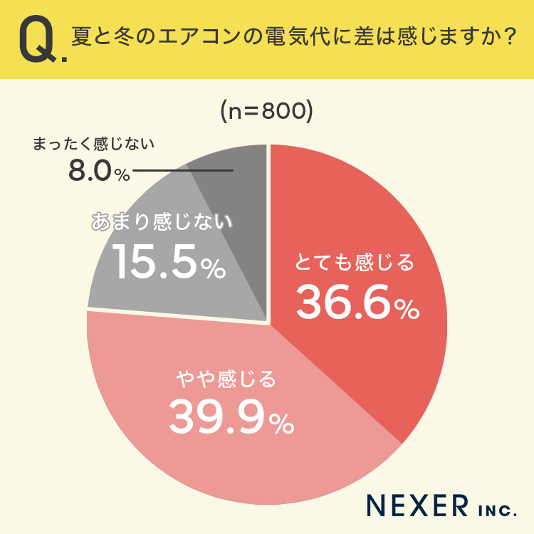 次に、夏と冬のエアコンの電気代に差を感じるかを調査しました。