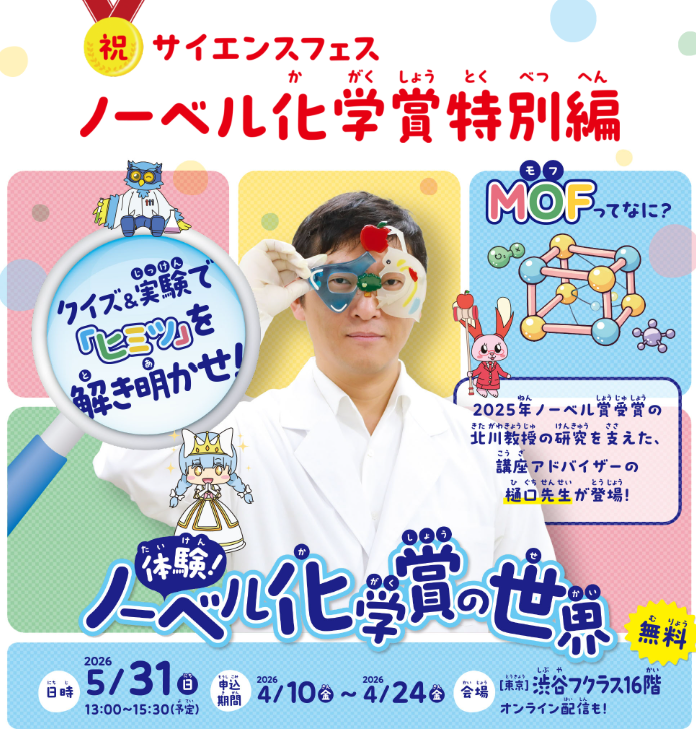 教育事業を展開するヒューマンアカデミー株式会社(本社:東京都新宿区、代表取締役:田中知信、以下「当社」)の児童教育事業「ヒューマンアカデミージュニア」は 、2026年5月31日(日)にサイエンスフェス ノーベル化学賞特別編として「体験!ノーベル化学賞の世界」を開催いたします。本イベントは、同社が運営する科学教室「サイエンスゲーツ」によるスペシャルプログラムで、受賞研究を支えた専門家が登壇します。子どもたちが世界で注目されている最先端科学「MOF(金属イオンと有機分子から成る、ジャングルジムのような空洞をもった多孔性物質)」をテーマに、クイズや実験を通じて科学の楽しさと驚きを体験できるプログラムを提供します。会場(渋谷)とオンラインのハイブリッド形式で、全国の親子が無料で参加可能です。