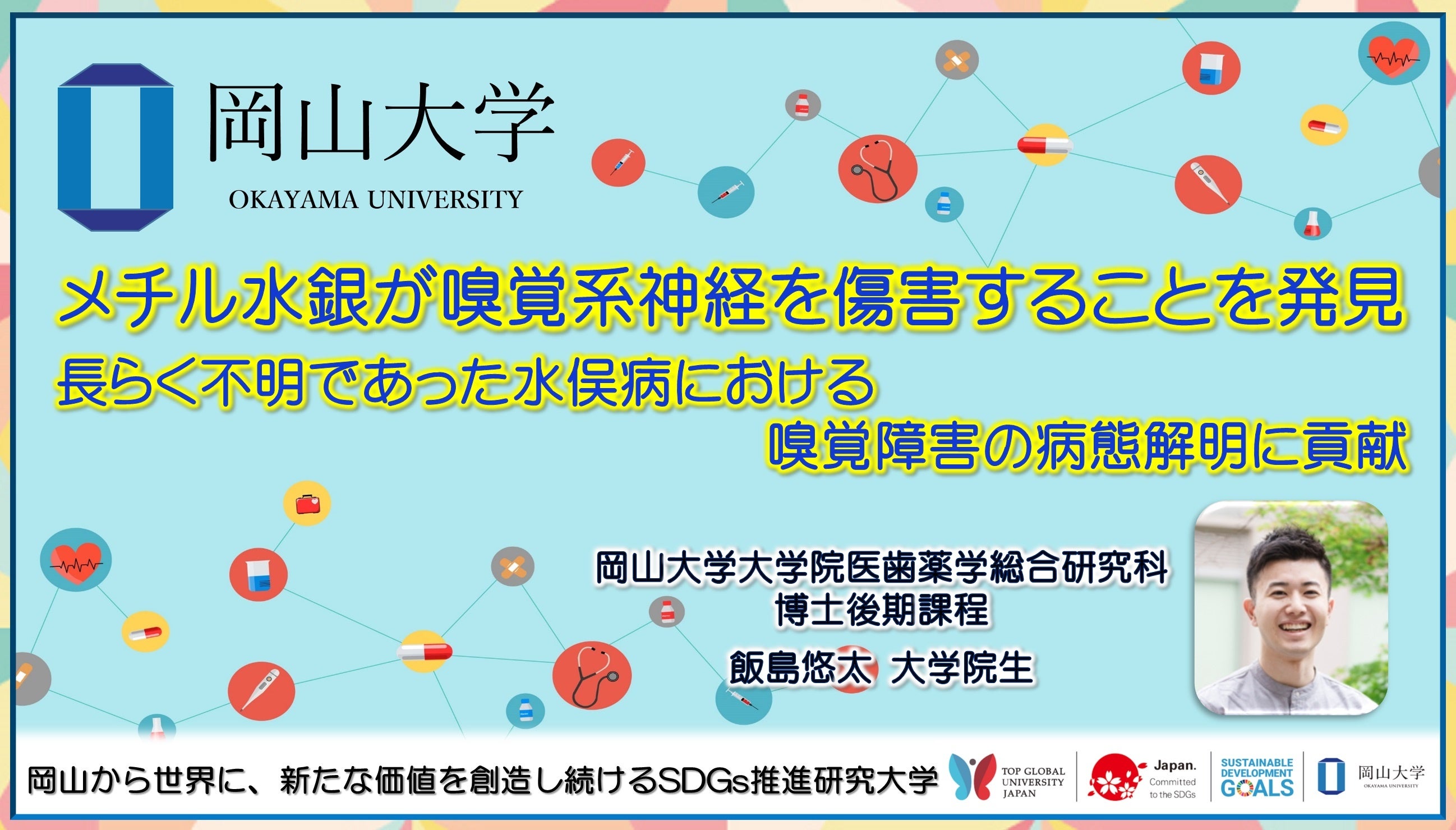 国立大学法人岡山大学(本部:岡山市北区、学長:那須保友)学術研究院医歯薬学域(薬)の上原孝教授、岡山大学大学院医歯薬学総合研究科の飯島悠太大学院生(博士後期課程3年)、国立水俣病総合研究センター基礎研究部の藤村成剛部長らの研究グループは、メチル水銀に曝露されたマウスにおいて、嗅覚に関与する脳領域や神経細胞が傷害されていることを初めて突き止めました。