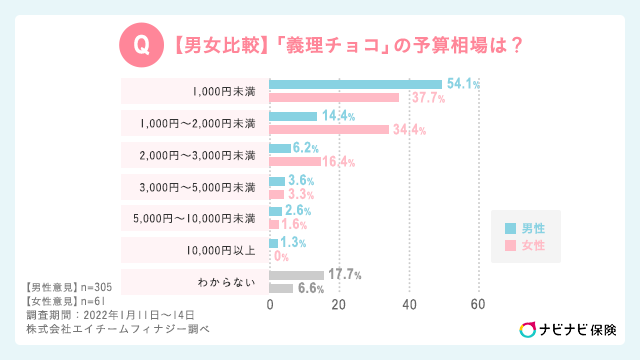 まず初めに、「本命チョコ」にかける予算について調査しました。すると、本命チョコの予算で男女に1.5倍の差がある結果となりました。