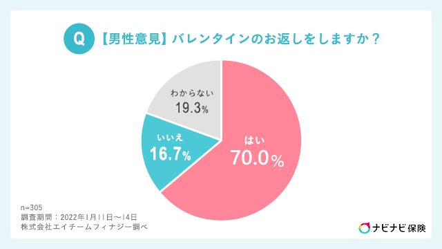 男性への「バレンタインのお返しをしますか?」の質問に対し、「お返しをする」と回答した男性は7割となりました。一方、2割弱の男性は「お返しをしない」と回答しました。