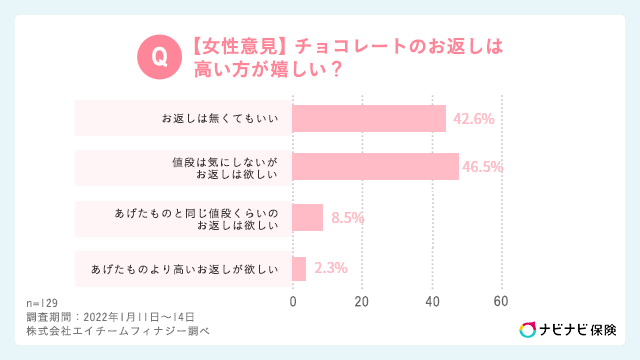 - 約4割以上の女性が値段は気にしないがお返しが欲しいと回答