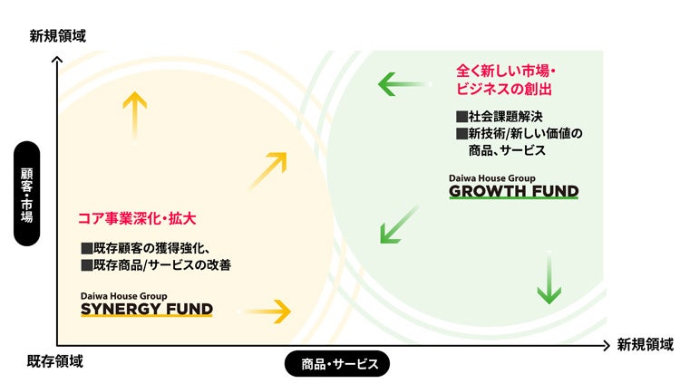 「大和ハウスグループ“将来の夢”ファンド」は、目的に応じて専門の知識を持った担当者がスタートアップ投資できるよう、大和ハウスグループの周辺領域の技術やサービスに投資する「シナジーファンド」と、既存事業の枠にとらわれない投資を実行する「グロースファンド」の2本のサブファンドを組成しました。