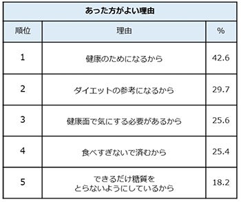 ※「あった方がよい理由」で提示した選択肢:ダイエットの参考になるから、食べすぎないで済むから、健康のためになるから、健康面で気にする必要があるから、できるだけ糖質をとらないようにしているから、できるだけ脂質をとらないようにしているから、足りない栄養素を後で補えるから、その他、特にない