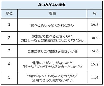 ※「ない方がよい理由」で提示した選択肢:飲食店で食べるときくらいカロリーなどの栄養を気にしたくないから、こまごました情報は必要ないから、情報があっても読みこなせない/活用できる知識がないから、だめだとわかっても我慢できないから、食べる楽しみをそがれるから、健康に自信があるから、健康にこだわりがないから(好きなものを好きなだけ食べたいから)、その他、特にない