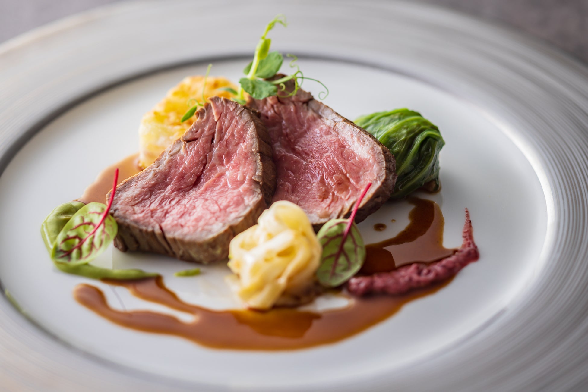 〇近江牛フィレ肉のポワレ 赤ワイン ジュ・ソース 赤と緑のマスタードのアクセント