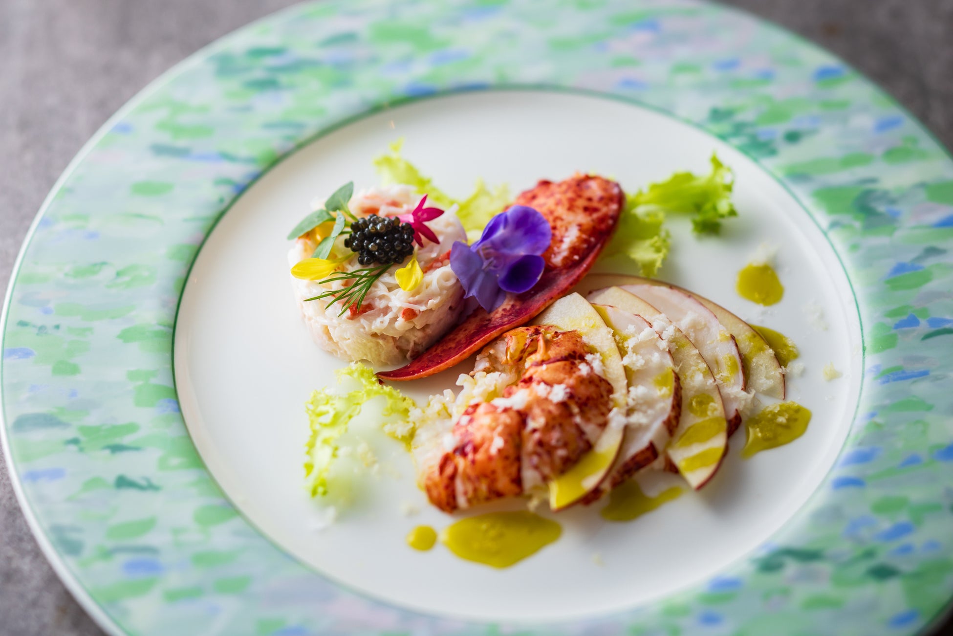 〇オマール海老とリンゴ 蟹とセロリのサラダ仕立て キャビア飾り フルール・ド・セルとピスタチオオイルの香り