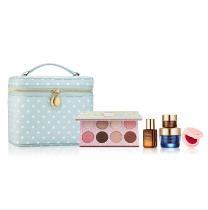 エスティ ローダー×ラデュレのコラボレーション。特製バニティ バッグに、アイシャドウ パレット、リップ バーム、スキンケア アイテムを詰め込みました。