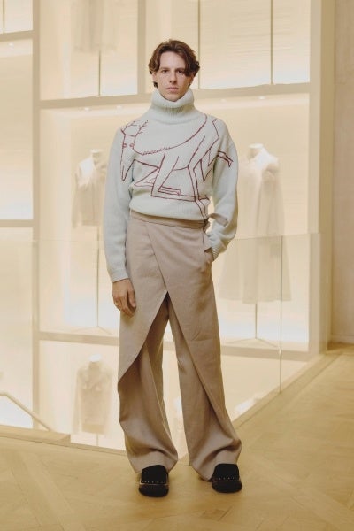 ジェルマン・ルーヴェは、2025年 サマー メンズ コレクションから、ウールジャージータートルネック、ベージュのウールとリネンのラップアラウンドパンツ、ブラックのスエードケープタウンブーツを合わせました。