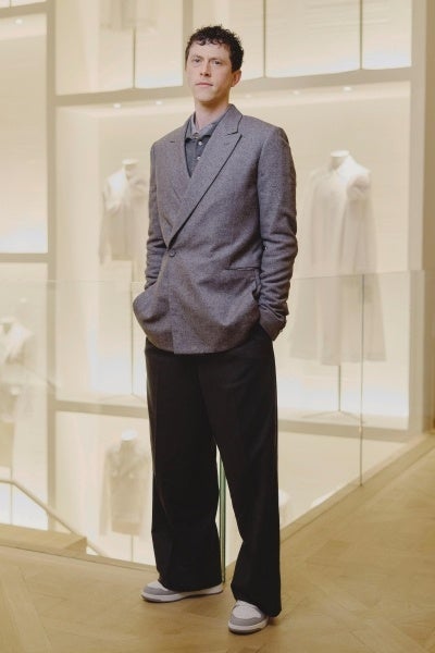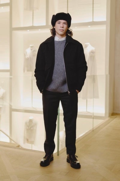 フィネガン・オールドフィールドは、2024年 スプリング「ディオール アイコンズ」カプセルコレクションから、グレーのカシミア&スリックフランネルのオーブルックジャケットに、グレーのカシミアジャージーのニットポロ、グレーのカナージュエンボスシルクシャツを纏い、ダークグレーのカシミアパンツ、グレーとホワイトレザーの「B57」スニーカーを合わせました。