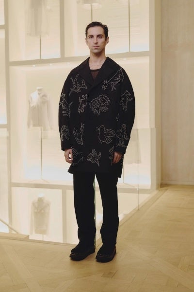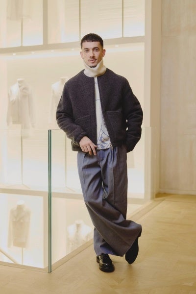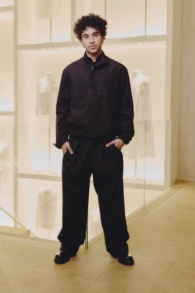 ハリル・ベン・ガルビアは、2025年 スプリング メンズ コレクションから、ブラックシルクのプルオーバーシャツ、ブラックシルクのパンツ、ブラックウールのピークドラペルダブルブレストコートを纏い、ブラックレザーの「ディオール カーロ」ローファーを着用しました。