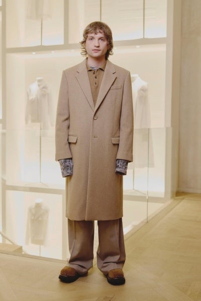 ルーカス・イオネスコは、2024年 スプリング「ディオール アイコンズ」カプセルコレクションから、キャメルのカシミアクロスのコートを纏い、キャメルのカシミアジャージーのニットポロ、ベージュのカシミア&ミンクのフランネルパンツ、ベージュのスエードケープタウンのクロッグを合わせました。
