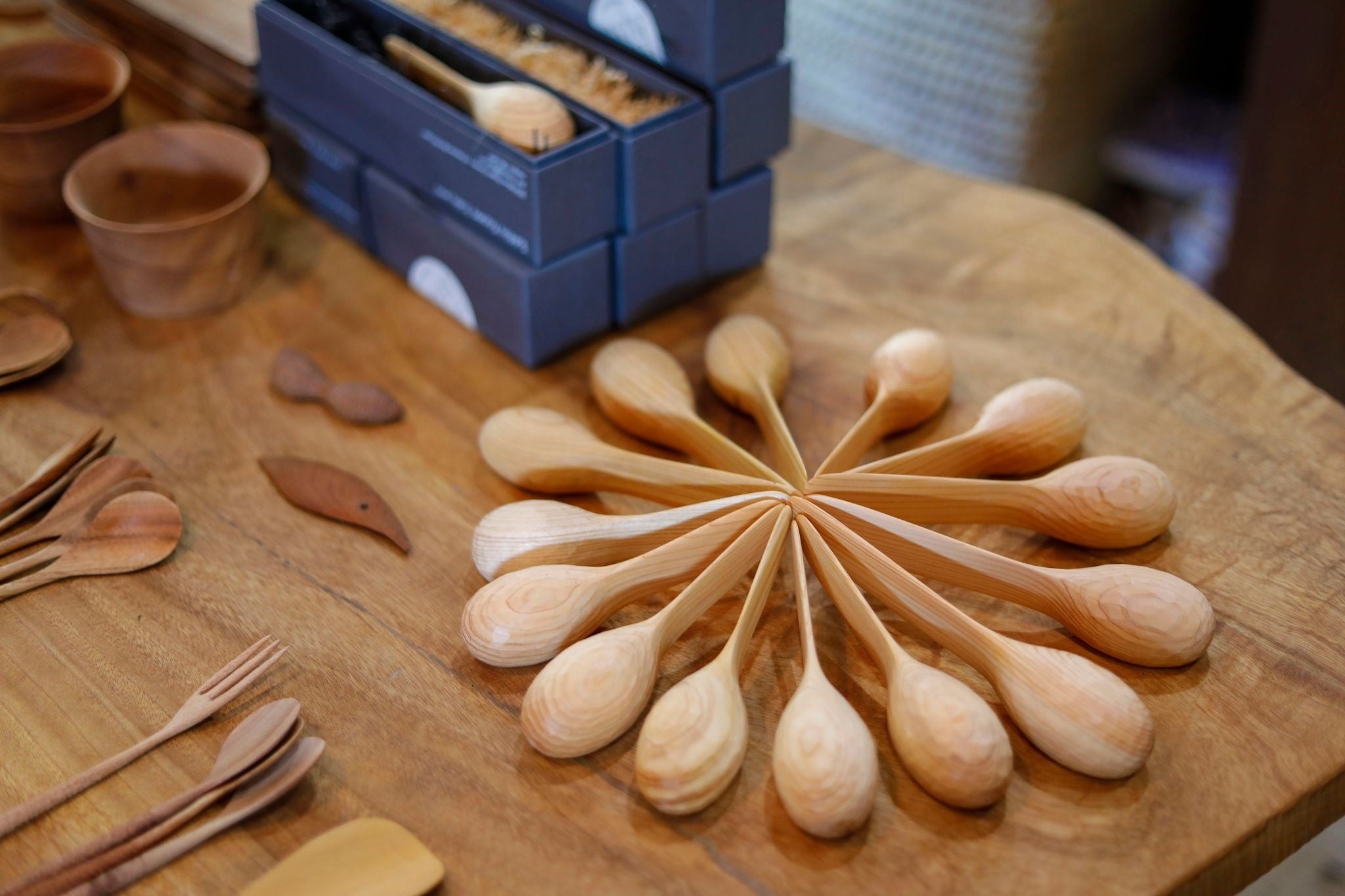 熊本で彫刻活動を行う上妻利弘さんが手掛けるブランド<TETARD / テタール>からは、手彫りのバターナイフを展開します。「テタール」とは、フランス語で「おたまじゃくし」のこと。地元のヒノキ材を使った温もりのある質感が手に馴染みやすいだけでなく、バターナイフの先がテーブルに付かない仕様なので、使い勝手も◎。経年変化で木独特の艶が生まれるのも魅力の一つ。ギフトボックス入り。