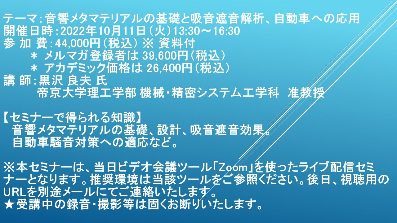 先端技術情報や市場情報を提供している(株)シーエムシー・リサーチ(千代田区神田錦町: https://cmcre.com/ )では、 各種材料・化学品などの市場動向・技術動向のセミナーや書籍発行を行っておりますが、 このたび「音響メタマテリアルの基礎と吸音遮音解析、自動車への応用」と題するセミナーを、 講師に黒沢 良夫 氏 帝京大学理工学部 機械・精密システム工学科 准教授)をお迎えし、2022年10月11日(火)13:30より、 ZOOMを利用したライブ配信で開催いたします。 受講料は、 一般:44,000円(税込)、 弊社メルマガ会員:39,600円(税込)、 アカデミック価格は26,400円(税込)となっております(資料付)。