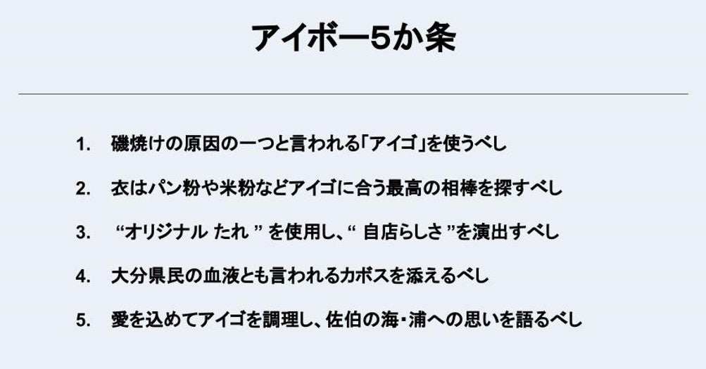 アイゴのフライ「アイボー」は、アイボー5か条にそって各店舗ごとの工夫をこらした「アイボー」が提供される予定です。詳しくは、佐伯ウラオモテアクトの公式Instagramをご確認ください。
