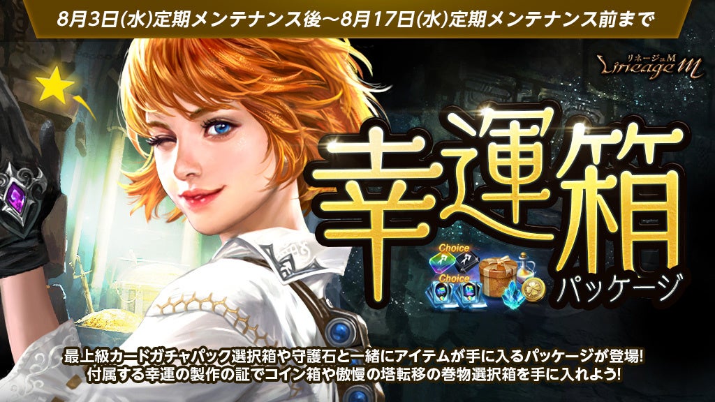 変身かマジックドールを選択して獲得できる「最上級カードガチャパック選択箱」と、スキルツリーを活性化させるために必要な「守護石」や、各ステータスを恒久的に上昇させるエリクサーの製作材料が複数個獲得できる「ピュアエリクサー箱(10~50個)」と、様々なダンジョンの入場時間延長アイテムの製作材料となる「時間補充石選択箱3個」がセットになった「幸運箱パッケージ」が登場しました。