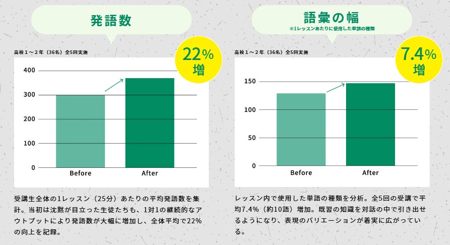検証の結果、受講生全体(高校1~2年生 36名、全5回実施)の1レッスン(25分)あたりの平均発語数が22%増加、さらに1レッスン内で使用される単語の種類(語彙の幅)も平均7.4%(約10語)増加するという成果を記録しました。